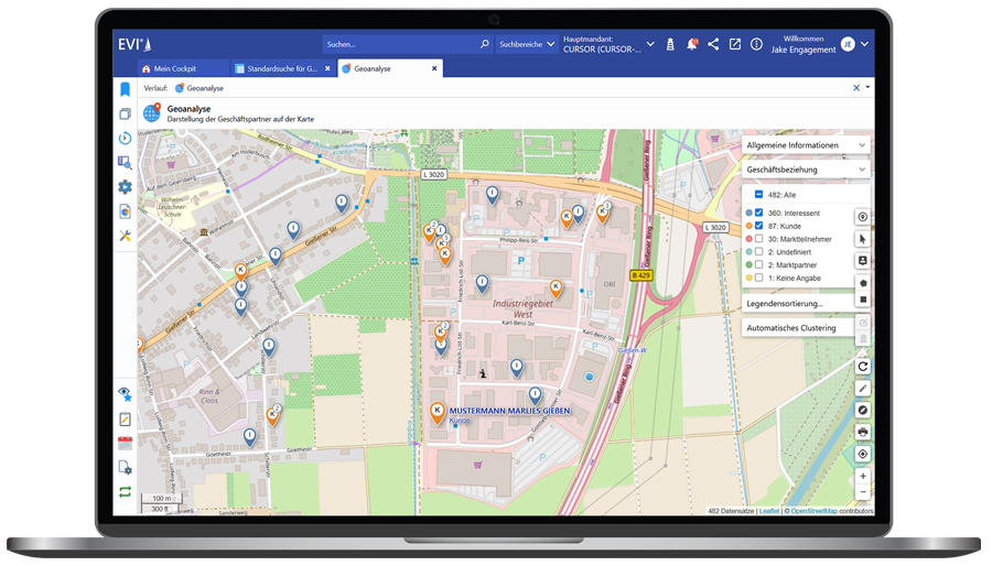 „Wo sind meine Kunden? Wo muss ich hin?“ Die CURSOR-Geoanalyse gibt Ihnen Antworten für diese täglichen Fragen aus den Bereichen Geomarketing und Geovertrieb. Die optionale Erweiterung der Grundfunktionen von CURSOR-CRM, EVI und TINA stellt Ihnen dazu alle gewählten Daten auf einer virtuellen Karte dar. Hier können Sie direkt auswählen und bearbeiten.