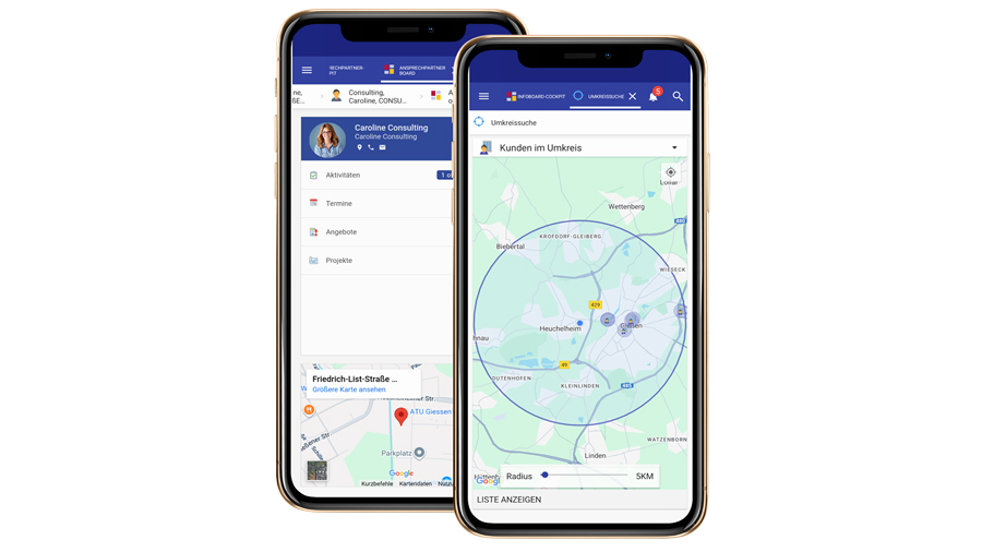 Besonders praktisch ist die Routenoptimierung zwischen gewählten Adressen, inklusive der Rückübertragung von Aktivitäten in das CRM-System. Auch die Umkreissuche hilft dabei, effizient den nächsten Kunden zu finden.